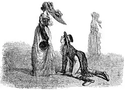 Cham was known for his racist portrayal of French people of colour.[1] He was specifically targeting black women and drew them as animal-like, stereotyped caricatures. One example is his caricature of Alexander Dumas crossed dressed like a wet nurse, which was a popular profession for black women in the post-slavery era in 19th-century France.[1] In a different caricature, he referred to the milk of a black wet-nurse as "black shoe polish".[1]