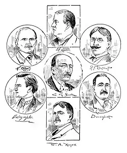 Some prominent cartoonists of the late 19th century: Charles Nelan, Frederick Opper, R. F. Outcault, C. G. Bush, Louis Dalrymple, Homer Davenport, and W. A. Rogers