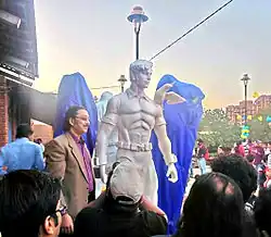 ![]() Anupam Sinha with the unveiled statue of his popular comic book superhero Super Commando Dhruva, at Comics Fest India, 2013 | |