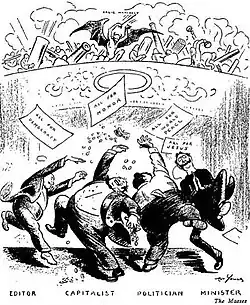 That little had been heard of these occurrences outside of West Virginia troubled the magazine's staff. Young's cartoon and Max Eastman's editorial, published in the same issue, claimed the AP willfully suppressed the facts to aid the coal companies. The AP responded to this with two suits of libel against Eastman and Young in November 1913 and January 1914. When Young and Eastman's attorney subpoenaed the records of the AP's Pittsburgh office, the suits were dropped; the paper said because AP feared the evidence and testimony would be damaging if they became public.
