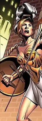 Athena later battled Pluto, and then met with the other Olympian gods to discuss their distaste at Ares' brutality.[8] When Olympus was then invaded by Mikaboshi's demons, Athena fought for Olympus and looked to Ares for battlefield strategy.[9] Athena joined the Olympians in battle against Mikaboshi's forces, and prevailed with the aid of the benevolent gods of the east.[10]