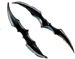 The batarang is a roughly bat-shaped throwing weapon used by the DC Comics superhero Batman. The name is a portmanteau of bat and boomerang, and was originally spelled baterang. Although they are named after boomerangs, batarangs have become more like shuriken in recent interpretations. They have since become a staple of Batman's arsenal, appearing in every major Batman television and film adaptation to date. Recent interpretations of the character find additional motivation to use the batarang as a ranged attack (alternative to firearms, which he usually rejects for personal reasons) and is used primarily to knock guns and other tools out of an assailant's hand.[1] They also serve as Batman's calling cards to alert criminal elements of his presence (much like the character's antecedent Zorro, who leaves the mark "Z" to his defeated foes) and props to create an illusion to the superstitious that he commands bats when he throws them.