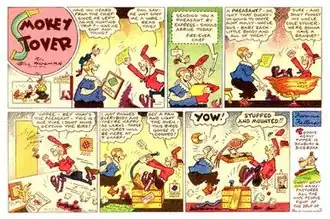 The daily Smokey Stover was not launched until November 14, 1938. Holman loved word play, and all of his features percolated with puns.[2] In his file cabinet, Holman kept thousands of puns. Readers of Smokey Stover often sent him puns, sometimes with accompanying illustrations.[6]