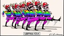 On 21 September 2016, during a nationwide debate about legalising same-sex marriage (SSM), The Australian published a Leak cartoon depicting a club-carrying, goose-stepping platoon, wearing rainbow-coloured NAZI SS uniforms, captioned "Waffen-SSM", which provoked significant controversy. Comedian Ben McLeay criticized Leak's cartoon, writing that it was harmful and morally repugnant.[30] Peter Wertheim, Executive Council of Australian Jewry executive director, said that the cartoon was an inversion of history.[31][32][33]