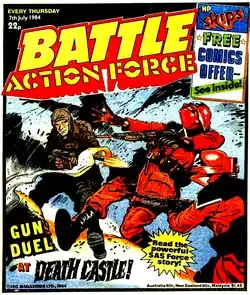 ![]() Eagle of Action Force's SAS Force battling Red Shadows on the cover of Battle Action Force, dated 7 July 1984. Art by Ron Turner. | |