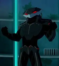 Black Manta dons an armored battle suit that serves multiple purposes, allowing him to rival Aquaman and other Atlanteans. The suit provides him with an unlimited air supply, communication capabilities, enhanced strength, and the ability to withstand the ocean's extreme pressures. The helmet lenses are equipped with advanced laser beams capable of cutting through carbon steel, as well as infrared vision. The suit is insulated and its dark coloration provides camouflage benefits, allowing him to even adopt other disguises.[40][42]