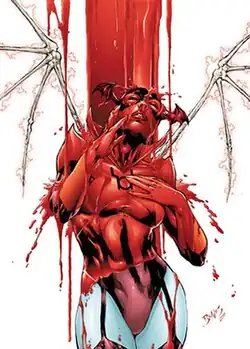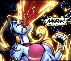 After Abysmus poisons the Red Lantern central power battery, Bleez returns to Ysmault with her Red Lanterns, briefly coming into conflict with Atrocitus. After Atrocitus reasserts leadership over the Corps, Bleez confronts the Star Sapphires, whom she believes to be responsible for the battery's destruction.[5][6] She is captured and nearly converted into a Star Sapphire before Atrocitus kills Abysmus, enabling Bleez to escape.[7][8]