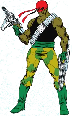Later, DuBois was contacted by employees of Lex Luthor, who sought a pawn to assassinate Luthor's archenemy Superman.[20] Operatives of Luthor, under the direction of a man named Kimberley, played upon DuBois' fixations on Vietnam to condition him psychologically to want to kill Superman.[21] They also equipped DuBois with an arsenal of powerful, advanced weapons, including a Kryptonite gun.[22] DuBois then went into action in Metropolis, calling himself Bloodsport.[23] He now claimed that both his brother and he had served in combat in Vietnam and had been injured there.[23] Professing rage at the citizens of Metropolis for wasting the freedom he claimed both his brother and himself fought to defend, Bloodsport indiscriminately slaughtered dozens of innocent people.[23] In his first clash with Superman, Bloodsport severely weakened him with a Kryptonite bullet.[24] After receiving medical aid, Superman confronted Bloodsport once more. Even Luthor, outraged by Bloodsport's murders of so many people due to the attention this would attract to his assault, attempted to stop the mad killer.[25] Superman succeeded in causing the teleportation device Bloodsport used to bring weapons to himself to malfunction.[26] Bloodsport then threatened to detonate his teleporter's power pack, blowing up ten square miles of the city.[27] Superman's friend Jimmy Olsen had learned of Bloodsport's true identity and located his brother.[28] Confronted by Michael, Bloodsport collapsed in grief and was taken into custody.[29]