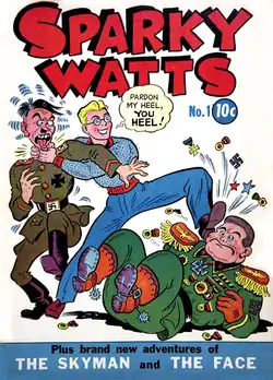 During the 1930s, Rogers illustrated cowboy comics for Dell Comics and DC Comics. Because Markey was part owner of the Columbia Comics Group (Skyman, The Face), reprints of Sparky Watts turned up in Columbia's Big Shot Comics, which featured other strips distributed by either Markey or the McNaught Syndicate (which distributed Mickey Finn and Toonerville Folks). Sparky Watts began in Big Shot #14 (June, 1941), and the character starred in four issues of his own comic for Columbia, beginning November, 1942.[4]