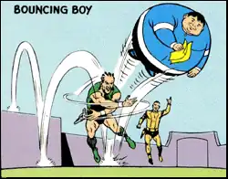Bouncing Boy is a member of the Legion of Super-Heroes who gained his abilities after accidentally drinking a super plastic formula which he believes to be soda. He later becomes a teacher at the Legion Academy and marries Luornu Durgo. However, the two leave the Legion due to a rule that prohibits members from being married and remaining in active duty at the same time.[3][4][5][6][7]