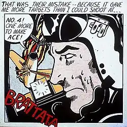 According to the University of Michigan Library, at one time the work was held in the Fischmann collection.[1] St. Louis businessman and financier, Milton Fischmann died in May 1974,[2] and the work is now in the collection of the Tehran Museum of Contemporary Art.[3] A trained draftsman and artist, Lichtenstein was a United States Army pilot who served in World War II without ever seeing active combat.[4][5] His list of aeronautical-themed works is extensive. Within that genre, Lichtenstein has featured pilots situated in cockpits during air combat in many of his works, such as Jet Pilot (1962), Brattata (1962), Bratatat! (1963), and Okay Hot-Shot, Okay! (1963).[6] The source of Brattata is All-American Men of War #89 (January–February 1962, DC Comics).[7] The same issue was the inspiration for several other Lichtenstein paintings, Okay Hot-Shot, Okay!, Blam, Whaam! and Tex![8] The graphite pencil sketch, Jet Pilot was also from that issue.[9] The pilot's mask is unbuckled, revealing the lower half of his face (as opposed to Bratatat! and Jet Pilot where only the eyes are visible).[10] The onomatopoeia presented graphically appears as a cliché.[11] In comparison to the original Lichtenstein increased the required number of downed planes for flying ace recognition by two,[12] possibly reflecting his own training.