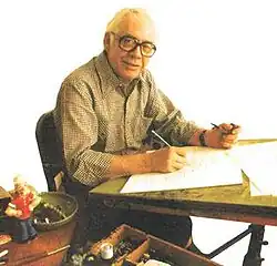 - Any part of my work can be interrupted for something important like golf or bowling. There are about 20 syndicated cartoonists living in my area, and they all enjoy dragging a fellow comic artist away from his drawing board. I hate to admit it, but I’m a deadline worker and do my best when my back is against the wall. In respect to ideas, I don’t buy gags; I do them myself… with the help of my family. My son, Brad, is developing into a great idea man. I made the mistake of paying him for an idea once, and he quickly lost his amateur standing. I do not like to write out a complete daily continuity too far in advance. When I have a continuity idea, I blab an outline into a small tape recorder and file it away until I’m ready for it. The day-to-day strips are done on a weekly basis. I feel that too-tight writing holds me down, and I lose the spontaneous ideas that always pop up when I’m working. As for my background, I started drawing at an early age because it was easier to make pictures than to learn to spell. I was born in Wenatchee, Washington. While I was still in high school I went to work for the late E. C. Segar, the creator of Popeye. I saw the birth of many wonderful characters: Swee’-pea, Eugene the Jeep, Alice the Goon and Poop-deck Pappy. In recent years I have added Granny and Betty Beasky. After Segar’s death in 1938, I was asked by King Features to continue the strip. Except for a period as an assistant comic editor, I have been doing the daily and Sunday Popeye ever since.[3]