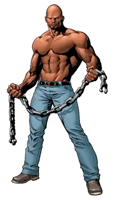 Carl Lucas is a resident of Harlem.[61] He was in a gang with his friend Willis Stryker until having regrets about a criminal life and leaving. When Stryker's girlfriend breaks up with him and seeks out Lucas, Stryker frames Lucas for drug possession.[62] Lucas is sent to prison and is abused when he refuses to be an informant.[63] He agrees to a dangerous experiment in the hope that it will help him get parole, but the experiment is sabotaged by a racist corrections officer in an attempt to kill him.[64] The experiment inadvertently gives Lucas superhuman strength and nearly impenetrable skin, which he uses to escape.[61] When he stops a robber and receives a cash reward, he decides to start a business as a super-powered private detective.[65][20] Lucas takes on a new name, Luke Cage,[61] and he later starts calling himself Power Man.[12]