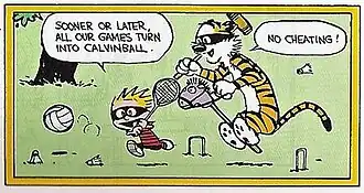 When asked how to play, Watterson stated: "It's pretty simple: you make up the rules as you go."[73] In most appearances of the game, a comical array of conventional and non-conventional sporting equipment is involved, including a croquet set, a badminton set, assorted flags, bags, signs, a hobby horse, water buckets and balloons, with humorous allusions to unseen elements such as "time-fracture wickets". Scoring is portrayed as arbitrary and nonsensical ("Q to 12" and "oogy to boogy"[74]) and the lack of fixed rules leads to lengthy argument between the participants as to who scored, where the boundaries are, and when the game is finished.[75] Usually, the contest results in Calvin being outsmarted by Hobbes. The game has been described in one academic work not as a new game based on fragments of an older one, but as the "constant connecting and disconnecting of parts, the constant evasion of rules or guidelines based on collective creativity."[76]