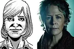 ![]() Carol, as she appears in the comic book series (left) and as portrayed by Melissa McBride in the television series (right). | |