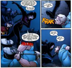 As Orphan, Cassandra is later inducted into Batman and Batwoman's "boot camp" for young Gotham vigilantes.[33] Orphan is known for being the best fighter on the team. She tries to fight the team's battles alone and is known for sneaking into Stephanie Brown's and Harper Row's apartments in the middle of the night. When Batman is attacked by the Colony, she tries to take them on by herself and is left injured and later sedated after leading the Colony into their base. Clayface helps Batwoman, Red Robin, Spoiler, and the injured Orphan escape.
