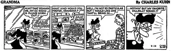 Grandma began April 14, 1947, distributed by Duke Richardson's Indianapolis-based Richardson Feature Service. A year later, the strip was picked up by King Features Syndicate which distributed it from June 28, 1948 until 1969. Kuhn was so totally absorbed by and devoted to his strip that when he was asked about hobbies, he answered, "Grandma and creating toys for the kids." Toys belonging to the neighborhood kids were also a key topic in many Grandma strips; she sometimes reverted to a second childhood and played with the toys herself. Kuhn's other main interest was fishing.[4]
