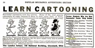While at NEA, he was able to train students through the correspondence course and then personally hire some upon graduation to draw features at the syndicate. Counted among Landon's most successful students were Carl Barks, Merrill Blosser, Gene Byrnes, Milton Caniff, Jack Cole, Roy Crane, V.T. Hamlin, Ethel Hays, Bill Holman and Chic Young. Their names were displayed in Landon's magazine advertisements which touted the accomplishments and high earnings of "former students who are now successful comic strip artists."[2] No one was turned down for the course except applicants under the age of 15. Landon's main competitor was W. L. Evans.