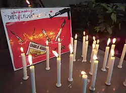 The website of Charlie Hebdo went offline shortly after the shooting, and when it returned it bore the legend Je Suis Charlie on a black background.[81] The statement was used as the hashtag #jesuischarlie on Twitter,[82] as computer-printed or hand-made placards and stickers, and displayed on mobile phones at vigils, and on many websites, particularly media sites. While other symbols were used, notably holding pens in the air, the phrase "Not Afraid", and tweeting certain images, "Je Suis Charlie" became more widespread.[83]