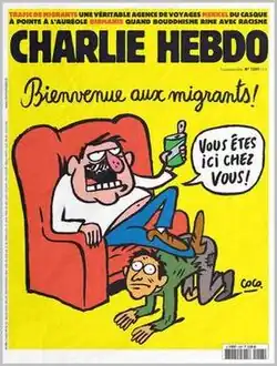 The 14 September 2015 edition's cover cartoon by Coco depicted a migrant being maltreated by a man who proclaims "welcome to refugees" – in order to parody European claims about compassion.[116] Riss wrote an editorial on the European migrant crisis, arguing that it was hypocritical for Hungarian politicians to declare themselves compassionate because of their Christian beliefs, but at the same time reject migrants from Syria. Riss parodied anti-immigrant attitudes by featuring a cartoon with a caricature of Jesus walking on water next to a drowning Muslim boy, with the caption "this is how we know Europe is Christian". The cartoons were widely seen as gallows humour in France, but prompted another wave of controversy abroad.[117] That issue also included a caricature of the dead body of Syrian Kurdish refugee child Alan Kurdi next to a McDonald's sign with the caption, "So close to the goal".[118] In response to criticism, Coco said that she was criticising the consumerist society that was being sold to migrants like a dream.[119] After the New Year's Eve sexual assaults in Germany, a January 2016 edition included a cartoon by Riss about Kurdi, reflecting fickle sentiment towards refugees by including a caption questioning whether the boy would have grown up to be an "ass groper in Germany".[120][121][122][123]