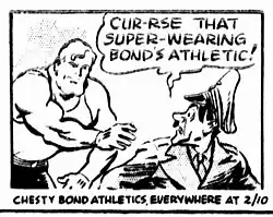 The central concept of the comic-strip was that Chesty Bond, with his characteristic jutting jaw and impressive physique, became a superhero while wearing his Bond's Athletic singlet.[10] Miller's wartime strips incorporated patriotic messages and invited readers to contribute to civilian efforts such as buying War Savings Bonds.[18][19] During the war-years Chesty Bond was often involved in encounters with the forces of Imperial Japan, including an encounter with General Tojo.[20]