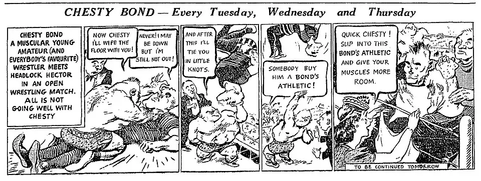 Chesty Bond is a fictional cartoon character and trademark for the Australian clothing company Bonds. The character was created in 1940, a co-creation of the advertising account manager Ted Moloney and artist Syd Miller. Chesty Bond was conceived as a likeable and heroic character in a continuous newspaper comic-strip, intended as a marketing campaign to sell the Bonds Athletic singlet. The comic-strip format, with a constantly changing storyline, proved to be extremely popular and continued to be published until 1963. Chesty Bond was possibly the world’s first daily advertising comic-strip. By virtue of its popularity and longevity, Chesty Bond became absorbed into Australian popular culture as a national icon.