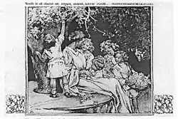 Women and children in Peck's work were depicted with great sensitivity in a wide variety of roles and responsibilities.[21] Art historian and illustrator Walt Reed describes Peck's style as "decorative in composition and sensitive in rendering".[8] Artistic themes found in Peck's work include education, child psychology, and the expectant mother.[8] The decorative style of the period was popularized by seminal American illustrator Howard Pyle and his female students.[27][28] According to Elizabeth H. Hawkes, curator emeritus of the Delaware Art Museum, the style consisted of "using flat, brightly colored figures boldly outlined and placed against a patterned background. They incorporated elements of the popular 1890s poster style and borrowed motifs from Walter Crane, Kate Greenaway, and the English Arts and Crafts movement style of illustration."[29]