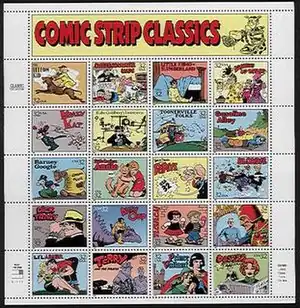 The Comic Strip Classics series of commemorative postage stamps was issued by the United States Postal Service on October 1, 1995, to honor the centennial of the newspaper comic strip.[1] The 20 stamps all are listed in the Scott catalogue as No. 3000 for a pane and 3000a through 3000t for the individual stamps.