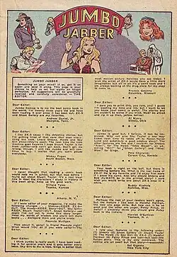 A comic book letter column is a section of an American comic book where readers' letters to the publisher appear. Comic book letter columns are also commonly referred to as letter columns (or lettercols), letter pages, letters of comment (LOCs), or simply letters to the editor. Letter columns appeared early on in the history of comic books themselves, and their growing prevalence—particularly beginning in the 1960s—helped create and legitimatize comics fandom.[1] As the forum developed, the volume and tenor of letters became a reliable gauge of overall reader response to developments in the comics themselves.[1] Letter columns remained a regular feature of most comic books until the early years of the 21st century, when they began being phased out in favor of the growing prevalence of email and Internet forums. Despite this, the 2010s saw a renaissance of comic book letter columns, and many comics titles still print them.[2]