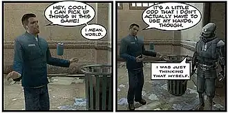 Much of the comic's dark humor is derived from its contrasts with Half-Life 2: in a depressing, dark vision of a conquered humanity's future, Gordon Freeman becomes a hero and savior; the similarly named Gordon Frohman, on the other hand, is just an average person, improbably cheerful to the point of stupidity, and somewhat naïve as to what is actually going on around him.[8] For instance, Frohman fails to realize that his return-addressed letters to Doctor Breen reveal his location, and so result in that location being invaded, bombed, or otherwise compromised.[‡ 9]