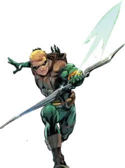 Connor also applied for membership in the JLA, replacing his father.[10] On the date of his second interview, he singlehandedly saved the League from the hands of the Key, defeating the Key's robots by using his father's old trick arrows after the Key had destroyed his own. In the end, he knocked out the Key using his father's trademark boxing glove arrow, and was accepted as a member of the JLA.[11]