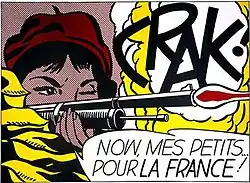 Crak! (sometimes Crack!) is a 1963 pop art lithograph by Roy Lichtenstein in his comic book style of using Ben-Day dots and a text balloon. It was used in marketing materials for one of Lichtenstein's early shows. It is one of several of his works related to military art and monocular vision.