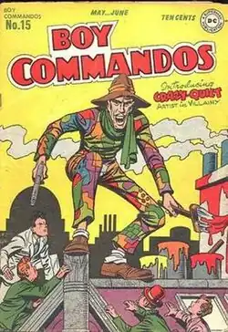 ![]() The first appearance of Crazy Quilt, as depicted on the cover of Boy Commandos #15 (May 1946); art by Jack Kirby. | |