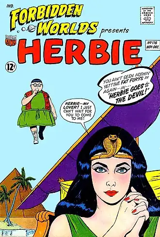 American Comics Group (ACG) was an American comic book publisher started in 1939 and existing under the ACG name from 1943 to 1967.[2] It published the medium's first ongoing horror-comics title, Adventures into the Unknown.[3][4] ACG's best-known character was the 1960s satirical humor hero Herbie Popnecker, who starred for a time in Forbidden Worlds. Herbie would later get his own title and be turned into a superhero called the Fat Fury.