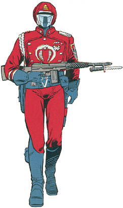 These soldiers, which are featured in the cartoon G.I. Joe, are the elite of Cobra. As with all soldiers in the first season they fight on land, sea, and air acting almost as officers as well as serving as Cobra Commander's bodyguards. On at least one occasion, Cobra Commander refers to his "Red Guard". In the first-season episodes after the "Pyramid of Darkness" mini-series, Crimson Guard members also act as deep-cover or sleeper agents, conducting operations in civilian guises that would require either too many operatives or too long an operation time for Zartan to be a feasible agent. In the second season, they seemed to serve more as bodyguards than anything else.