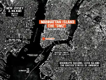 There was even a sense among troops that the U.S. forces were ready to start reclaiming territory from and pushing back the Free States army, until the calamity of Day 204, when a squad of U.S. soldiers mistakenly gunned down nearly 200 peace protesters. With the U.S. robbed of all momentum and public support for an advance, the two sides settled into an uneasy stalemate, where Manhattan is the location of the DMZ between the two warring parties, with the FSA occupying territory including New Jersey and inland, and the United States holding Brooklyn, Long Island, and other parts unknown. The U.S. government still holds at least part of New York State, and presumably other territories further northeast. In an interview, Brian Wood described the back-history as the citizens of Middle America having risen up against the pre-emptive war policies of the U.S. government, causing a Second American Civil War.[1] He expanded on this in a later interview: