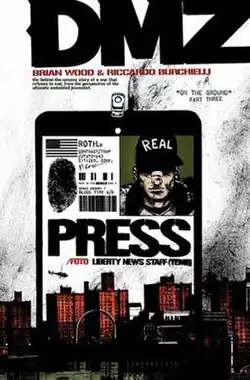 ![]() Cover art by Brian Wood for DMZ issue #3 – the third part of the "On the Ground" arc – featuring the press pass of protagonist Matty Roth above the Manhattan skyline. | |