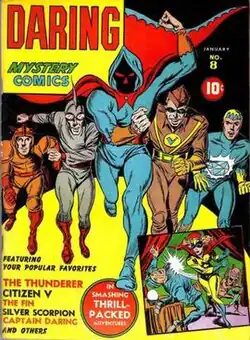 ![]() Daring Mystery Comics #8 (Jan. 1942). Left to right: Captain Daring, the Fin, the Thunderer, Citizen V, the Blue Diamond, and (inset) the Silver Scorpion. Cover art by Jack Kirby & Joe Simon. | |