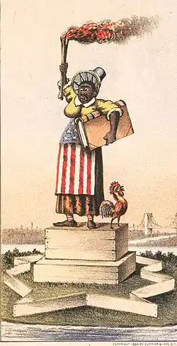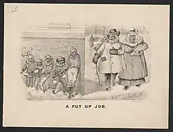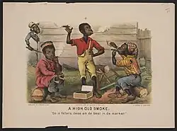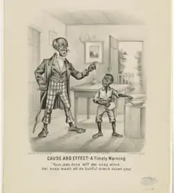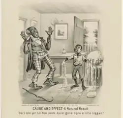 According to Marcy Sacks of Albion College, the Darktown representations "lampooned black people in order to discredit the urban migration of southern blacks" to rationalize northern Americans' withdrawal from reconstructionist ideals.[4] In the early pre-Civil War period prints typically alternated between representing happy, contented enslaved people with representing the horrific conditions for enslaved people;[2] Black people were portrayed in propagandistic ways in support of certain political agendas rather than as people with their own concerns.[5] As the Civil War drew nearer, Black people were represented as "the cause of sectional politics" and finally of the war itself.[2] During the war, "respect for Negroes rose together with the hostility against the white southerner," and Black people were portrayed as helping Union soldiers and spying for the Union.[5]