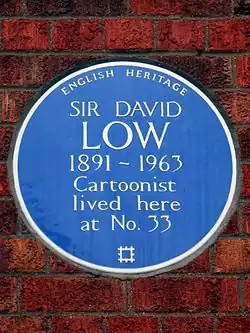 Low married Madeline Grieve Kenning of Auckland on 7 June 1920 in St. Paul's Church, Covent Garden; they lived for many years in Golders Green, North London.[1] The couple had two daughters: in 1939, Time described Low's breakfast as "a political meeting, with the cartoonist, his wife, and his two young daughters threshing out the news." His wife and daughters survived him.[1] In 1991 a Blue plaque was erected to commemorate his life at Melbury Court, Kensington High Street, London, W8 6NH in the Royal Borough of Kensington and Chelsea.[15]