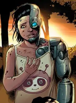 Death Locket is a cyborg with various technological abilities. She can interface with technology, enabling her to merge with and control it.[15][21][22][26] Death Locket's left arm is cybernetic and can extend long distances and transform into various weapons.[5][6][12][18][23][24][25]