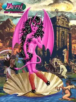 Demi the Demoness is a fictional, humorous, erotic comics character whose fantasy adventures have been published since 1992. Demi was created by SS Crompton. Demi has appeared in numerous comics crossovers with other characters, including Shaundra, Captain Fortune, Mauvette, Vampirooni, Erika Amerika, Cassiopeia the Witch, Djustine, Crimson Gash, and adult film stars Tracey Adams, Tabitha Stevens, Deja Sin, and Bonnie Michaels.