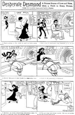 A parody of melodrama, it depicted a stereotypical villain named Desmond who continually tried to capture a damsel in distress named Rosamond, which brought him into conflict with her and her paramour Claude Eclaire;[3] Hershfield ended the strip by having Claude and Rosamond marry, which meant that Desmond could no longer pursue her.[4]