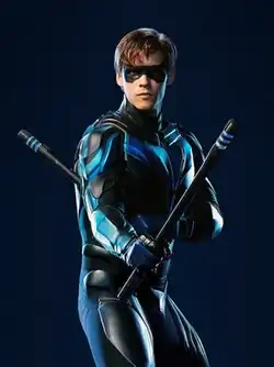 Richard John "Dick" Grayson, also known by his superhero alias Nightwing, is a fictional character and a superhero on the DC Universe, and later HBO Max, television series Titans,[1] based on the character of the same name created by Bill Finger,[2] and adapted for television by Akiva Goldsman, Geoff Johns and Greg Berlanti.[3] In this version, he has been acting as a superhero, going by Robin, for about 16 years, operating in Gotham City, under the wing of his adoptive father, Bruce Wayne / Batman, until he decides to leave the city, assuming the name Nightwing in the second season. Dick Grayson was portrayed by Brenton Thwaites from 2018 until 2023.[4]