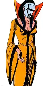 In her Silver Age appearances, Dr. Cyber was the brilliant head of a vast global criminal network. Beautiful, vain and possibly British[3] or of Asian descent (or both), she initially blended aspects of the femme fatale and dragon lady character tropes. Subsequent Bronze Age appearances incorporated science fiction elements: after her face was disfigured in an accident, Dr. Cyber donned an eerie muzzle-mask and a technologically advanced exoskeleton.[4] These cybernetic enhancements increased her physical strength, and gave her the ability to absorb energy, as well as to redirect it by firing blasts from her hands. Despite the resulting upgrades to her power, Dr. Cyber's disfigurement also wrought a mounting emotional instability: she became obsessed with recapturing her beauty by transferring her mind into Wonder Woman's body, a project she attempted several times with the help of her operative Doctor Moon.