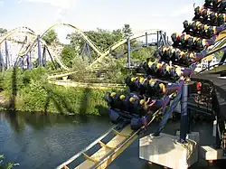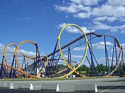After leaving the station, the train makes a small dip before making a 180-degree right turn to climb the 157-foot (48 m) tall lift hill. Once the train apexes the top of the lift, riders drop 148 feet (45 m) to the right at a 57-degree angle, reaching a maximum speed of 65 mph (105 km/h), into a 135-foot (41 m) tall vertical loop.[9] Following the loop, riders go through an overbanked right turn (which at Geauga Lake passed over the ride entrance) and rise up into a turnaround above the station. After the turn, riders enter a cobra roll. The train then rises uphill, makes a left turn under the lift hill, and enters the mid-course brake run. After the brakes, there is a small drop into a pair of interlocking corkscrews. Following the corkscrews, the train completes a 135-degree curve to the left that dives into a 270-degree curve along the ground, entering the final brake run.[9][10][11] One cycle of the ride lasts about 2 minutes and 6 seconds.[12]