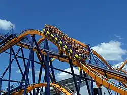Dominator operates with three open-air steel-and-fiberglass trains. Each train has eight cars that have four seats in a single row for a total of 32 riders per train.[9] Riders are secured by an over-the-shoulder restraint with a lap belt. In 2014, the seat color was changed from purple to black, and the restraint (previously all orange) added black to its color scheme.[13]