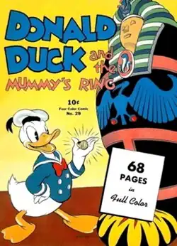 "Donald Duck and the Mummy's Ring" is a 28-page Disney comics story written and drawn by Carl Barks. It was first published in Donald Duck Four Color #29 (Sept 1943) with two backup stories also by Barks, "The Hard Loser" and "Too Many Pets".[1] It was the first long Donald Duck adventure story written and drawn by Barks. The story has been reprinted many times, including in The Carl Barks Library (1984) and The Carl Barks Library in Color (1994).