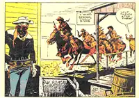 In concept, it was typical of all the Stan Lee-created Kids (Colt, Rawhide, Two-Gun, Ringo, etc.). What set it apart was Wildey's art. . . . The Outlaw Kid was a monthly opportunity for Wildey to hone and develop his burgeoning art skills. Using Outlaw Kid #11 (May 1956) as an example of his work well into the series, the influence of cinema on his work is evident. Though he may have had this influence all along, now it is readily apparent, with panels staged like film scenes. The characters have a realistic, illustrative look to them. . . . Most significantly, his artwork finally had the consistent luster of professionalism. Wildey varied his inking from the fine stroke of an etching to the bold use of solid blacks to attain dramatic chiaroscuro effects.[4]