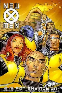 ![]() Cover of New X-Men: E is for Extinction (2001), trade paperback collected edition, art by Frank Quitely | |